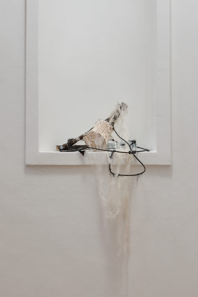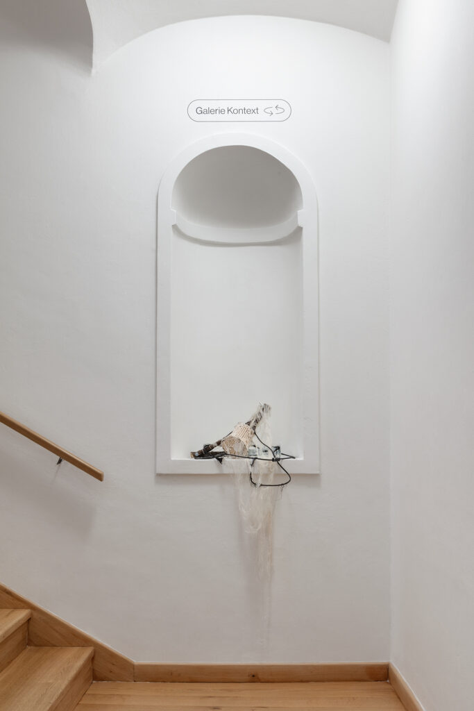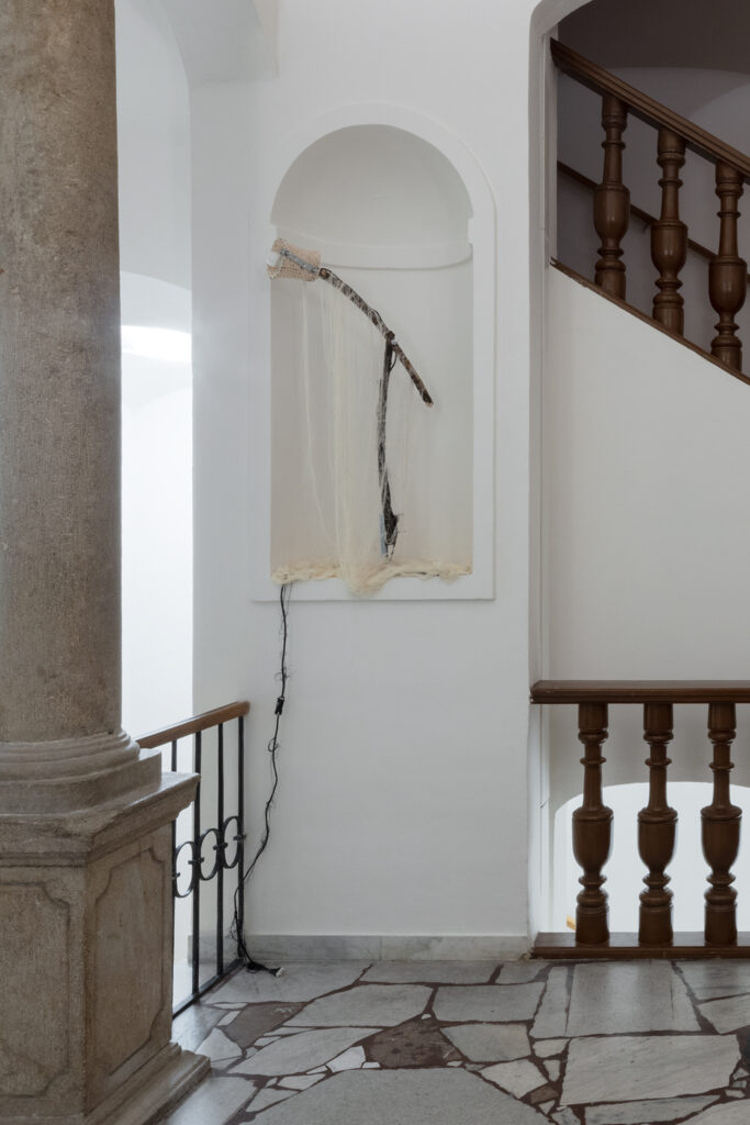 This atmosphere is enhanced by the music, composed by the artist herself, her singing and harmonica playing accompanied by metallic field recordings. The unsettling nature of the video is enhanced by the site-specific installation in the niches, which enters the space and evokes the invisible life of subterranean organisms and roots, their interconnectedness and connectedness. The journey through the exhibition symbolically concludes with the last niche, the imaginary culmination of a pilgrimage to the mountain, marked by a transformation into stone. The exhibition does not aim to criticize the current state of the mines, but to shed light on their mythology and hidden world. The artist is also drawn to the stories told by coal itself, a material formed from ancient organisms and forests. These are the stories of creatures from below the surface, geological sagas inscribed as the search for coal burrows ever deeper.