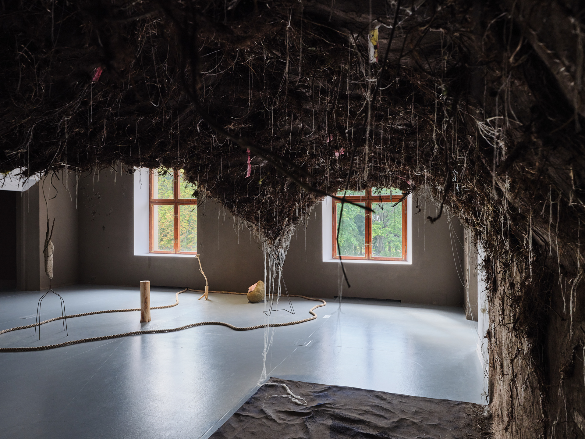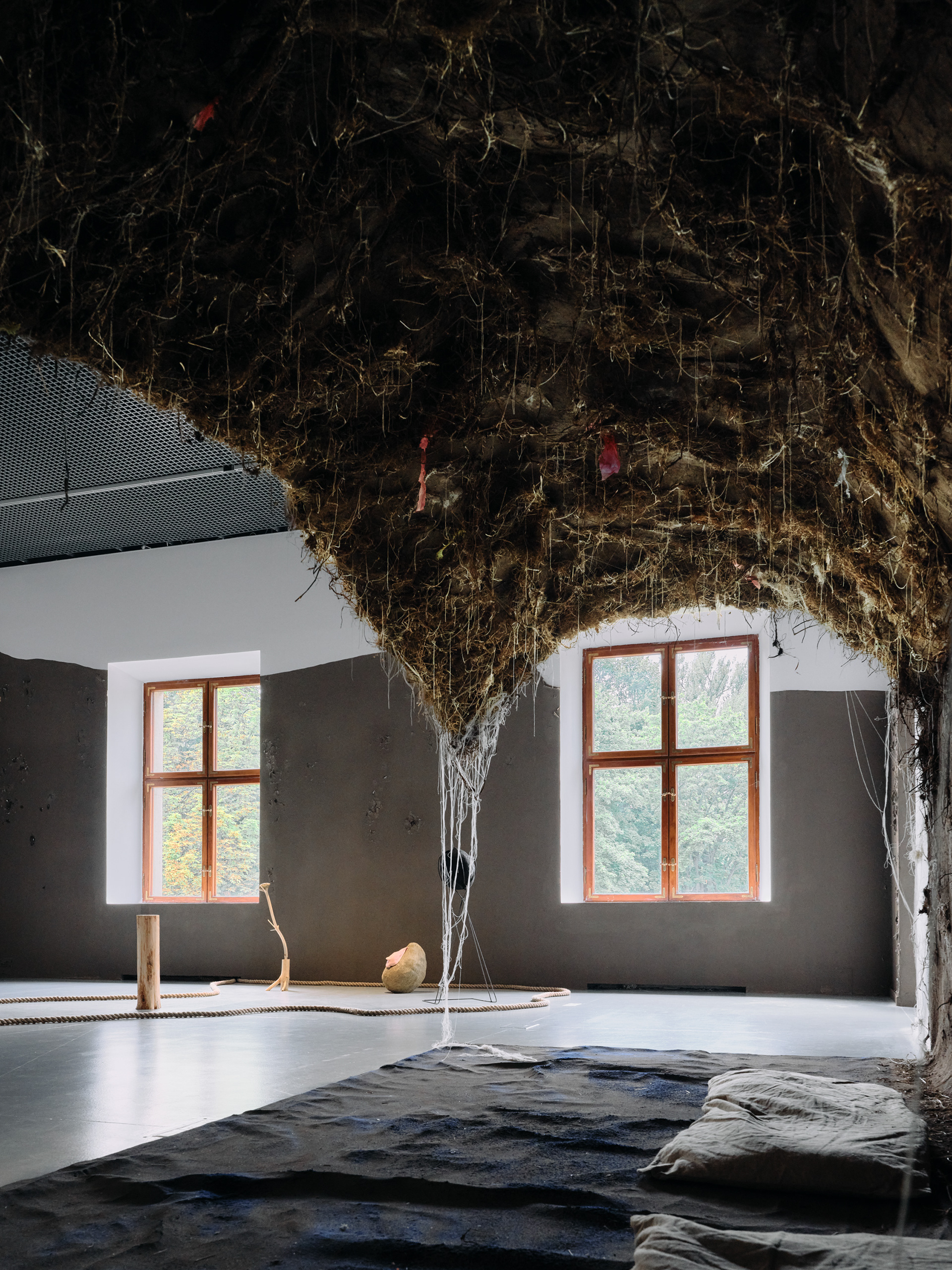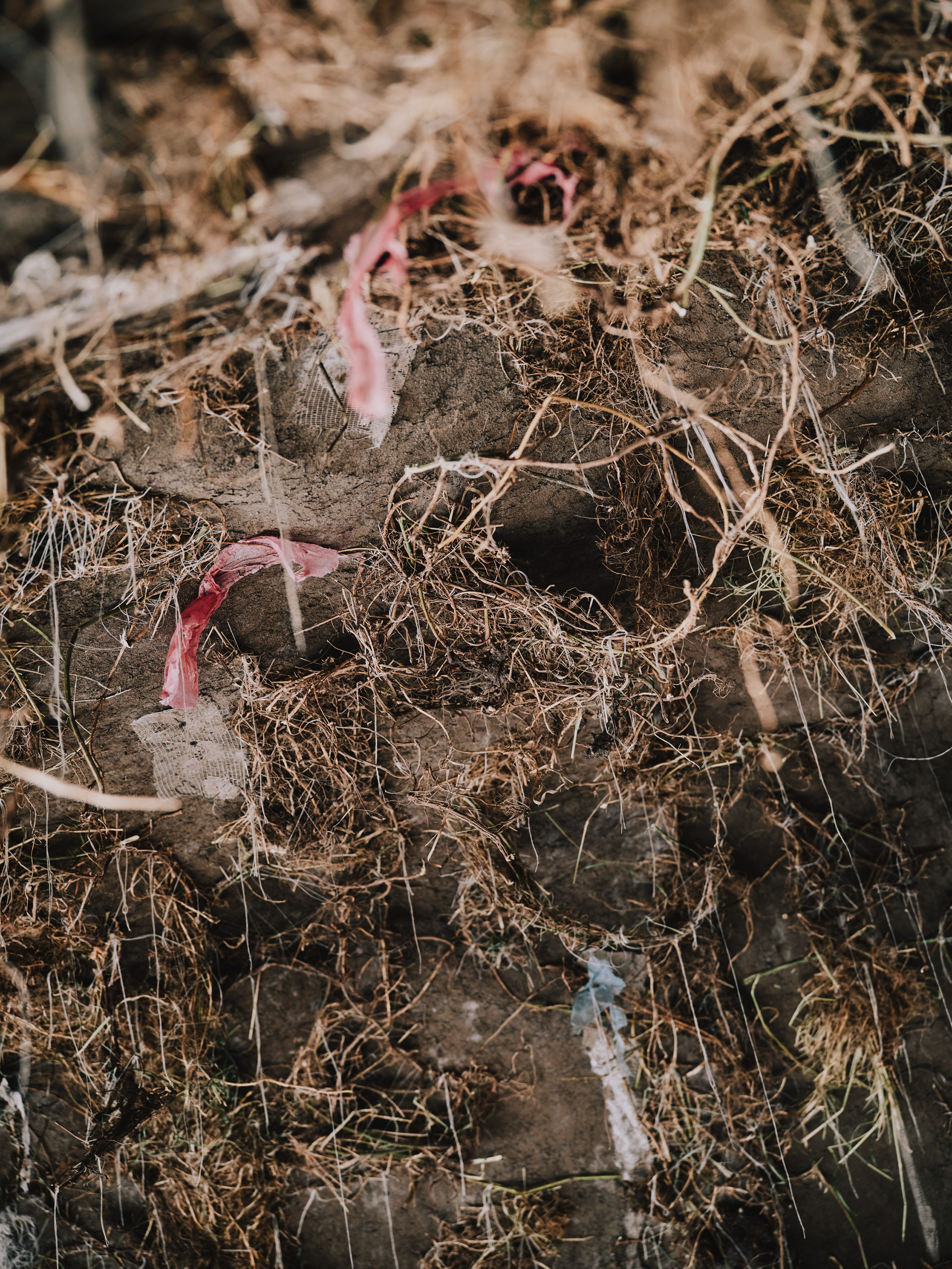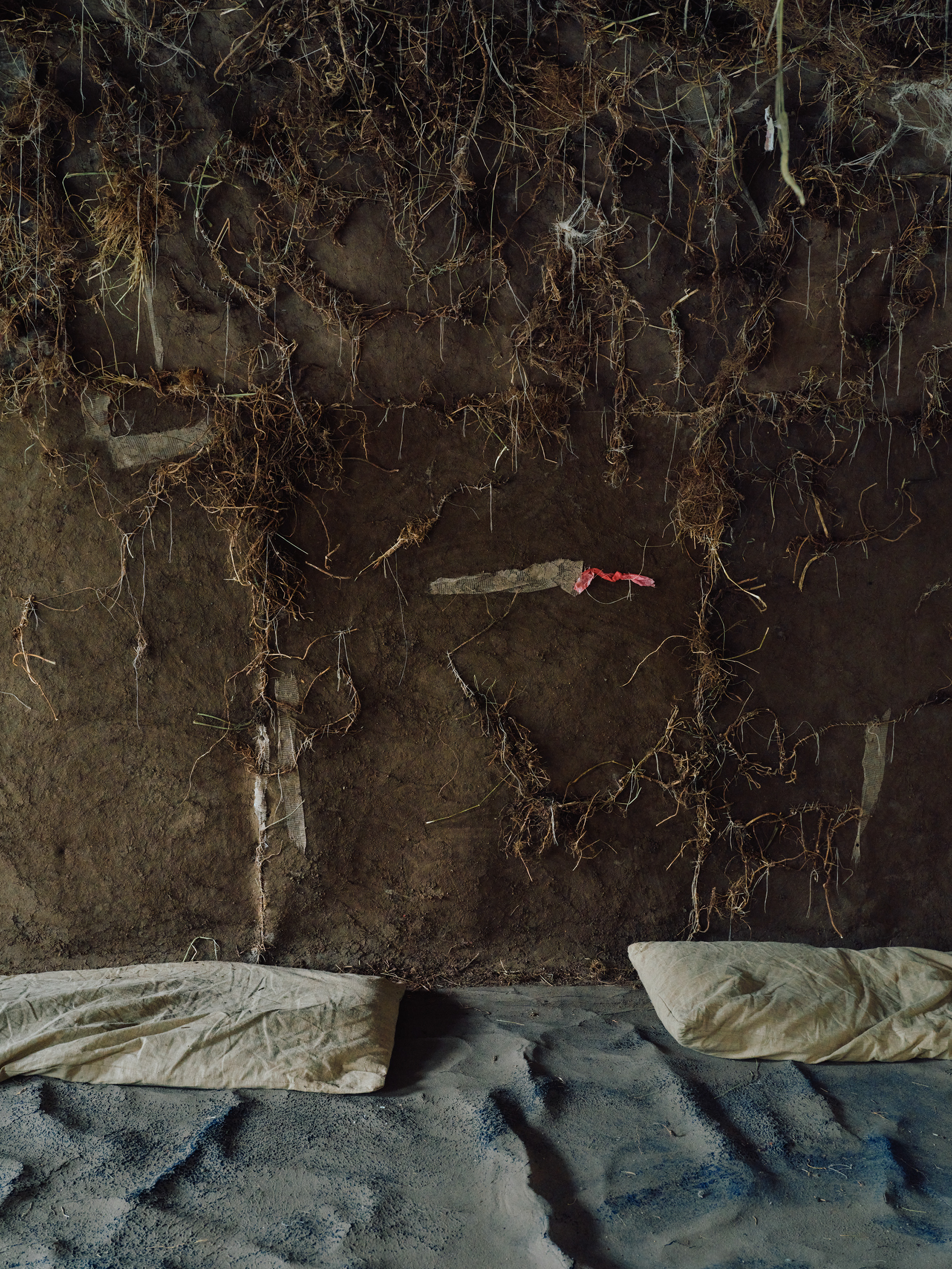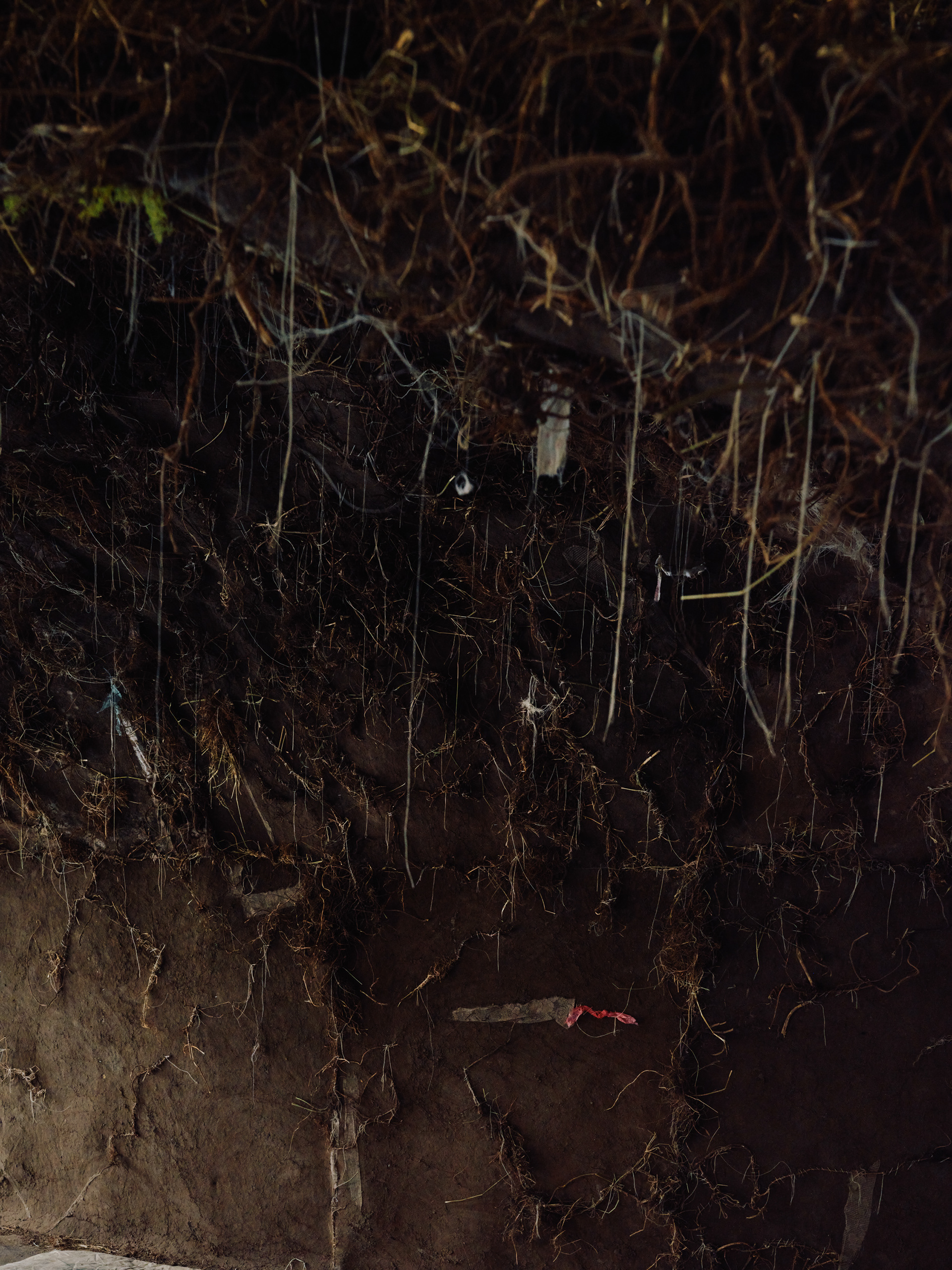installation, earth, roots, rubbish, scraps of household fabrics, wood, old carpet